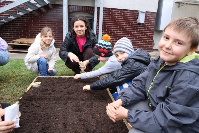 Następnie wszyscy udali się na podwórko, gdzie dzieci zakładały własny warzywny ogródek. Prace rozpoczęli od przygotowania odpowiedniego podłoża, warstwy drenażu, aby zapewnić roślinom odpowiednie warunki wodno-powietrzne. Następnie panie prowadzące wyjaśniły, które warzywa się „lubią” i możemy je posadzić obok siebie. Po czym dzieci zabrały się do siania warzyw. Na koniec obficie podlały swój mały ogródeczek i włożyły etykiety z nazwami nasion.