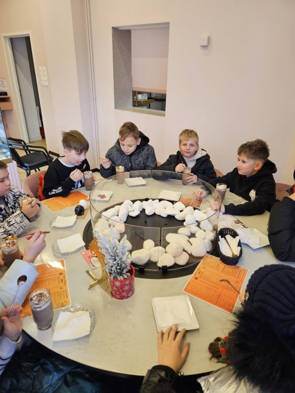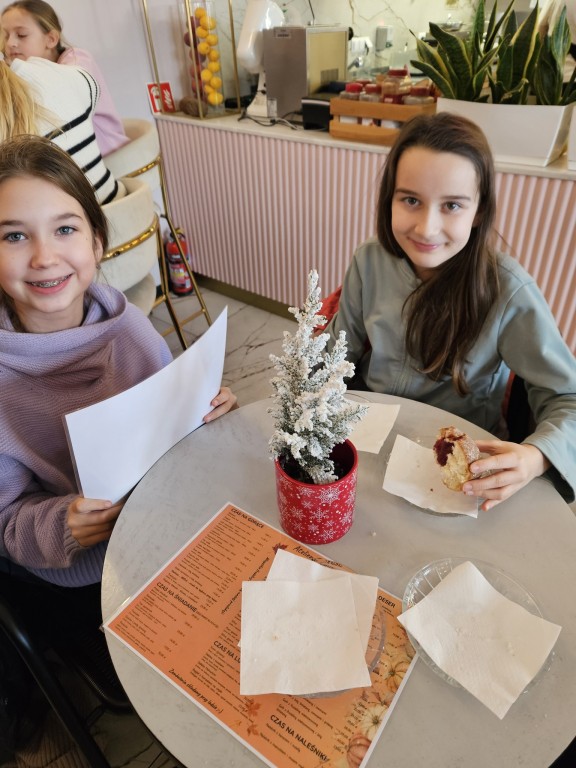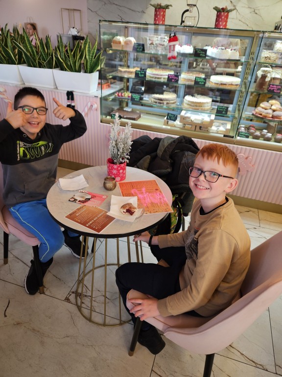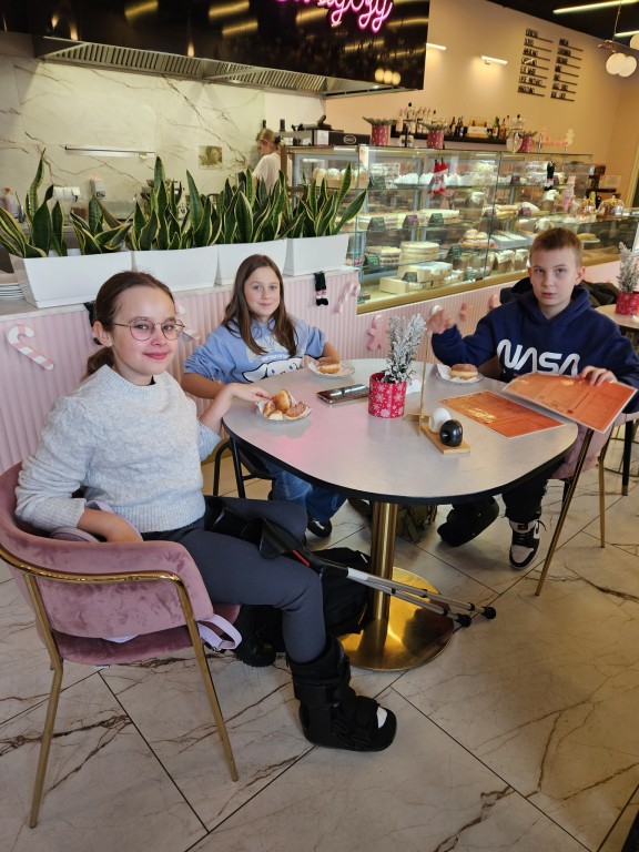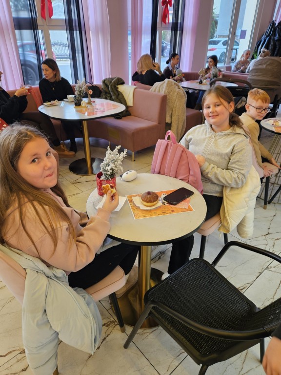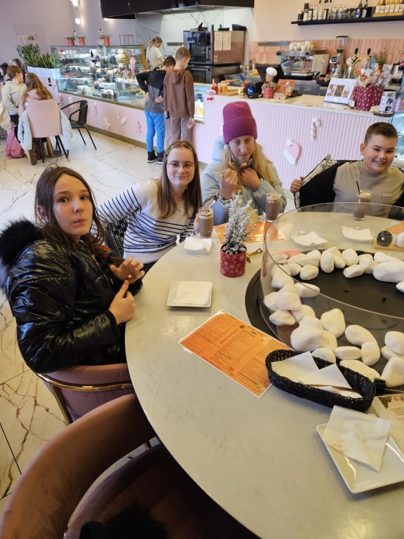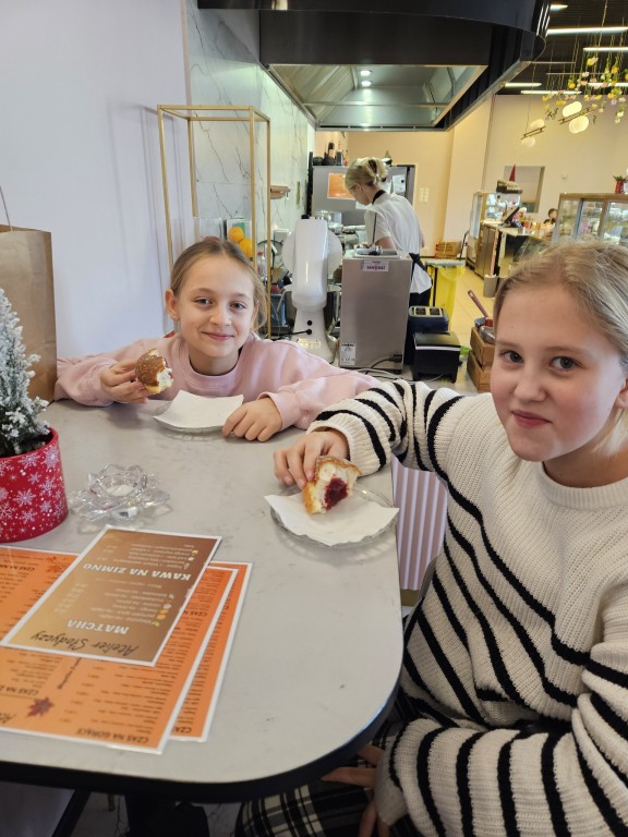 Ostatnim punktem wycieczki była wizyta w Kawiarni Atelier Słodyczy, gdzie na wszystkich czekała słodka niespodzianka – pyszny pączek oraz gorąca czekolada.