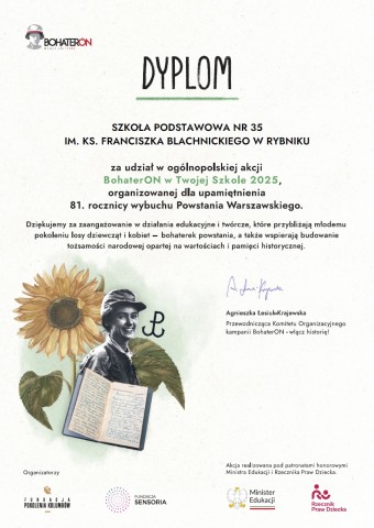 Dzięki aktywnej pracy oraz zaangażowaniu dzieci i ich opiekunów – pani Katarzyny Baranek, pani Beaty Szczerbowskiej i pani Iwony Pawliczek – nasza szkoła otrzymała pamiątkowy dyplom oraz została wpisana na mapę szkół uczestniczących w projekcie „BohaterOn w Twojej Szkole 2025”.