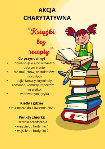 Uczniowie zaangażowani w akcję otrzymają pochwałę z dodatnimi punktami do zachowania. Informację o ilości przyniesionych książek prosimy dostarczyć w wiadomości na e-dzienniku do organizatorów lub na kartce do świetlicy.