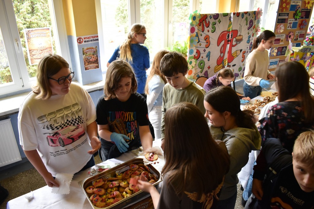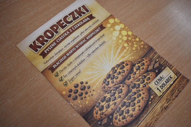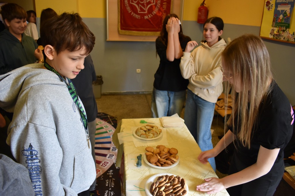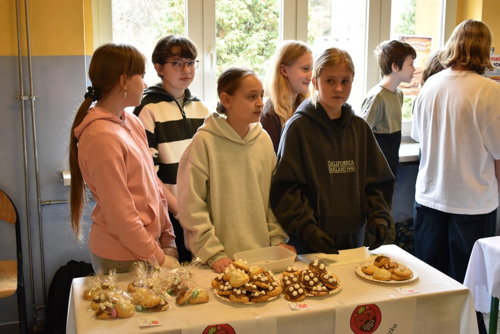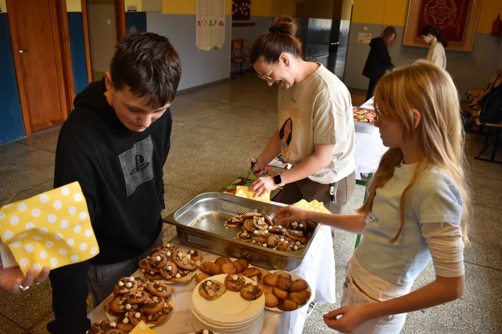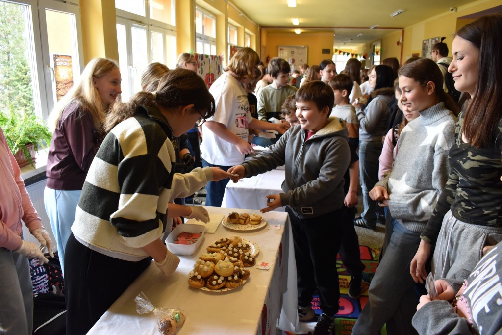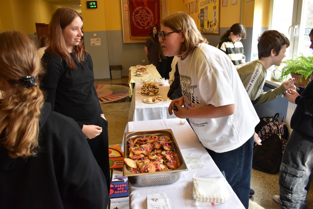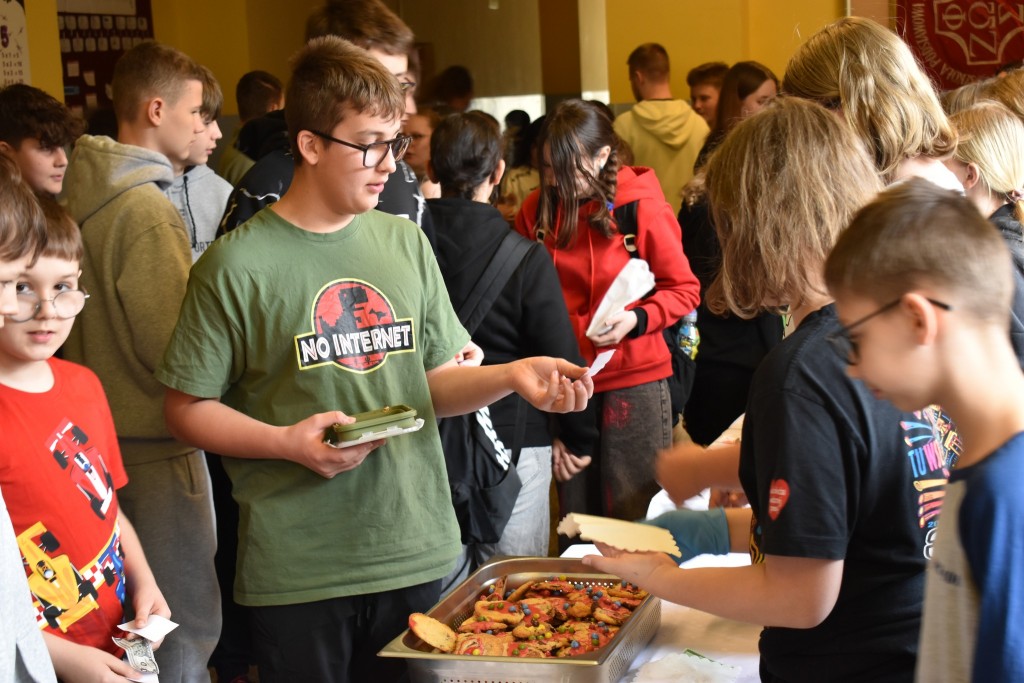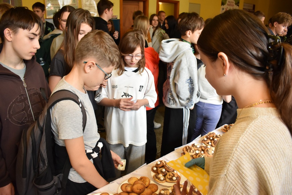 Uczniowie z ogromnym zapałem stanęli przy swoich kolorowych stoiskach, a wcześniej zadbali o wyjątkową oprawę wydarzenia — szkolne korytarze zostały obklejone samodzielnie przygotowanymi banerami reklamowymi, które tworzyły prawdziwą atmosferę targową.