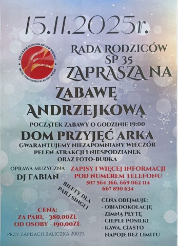 Rada Rodziców Szkoły Podstawowej nr 35 w Rybniku zaprasza na zabawę andrzejkową, która odbędzie się w dniu 15.11.2025r. o godz. 19:00 w Domu Przyjęć Arka w Jankowicach.