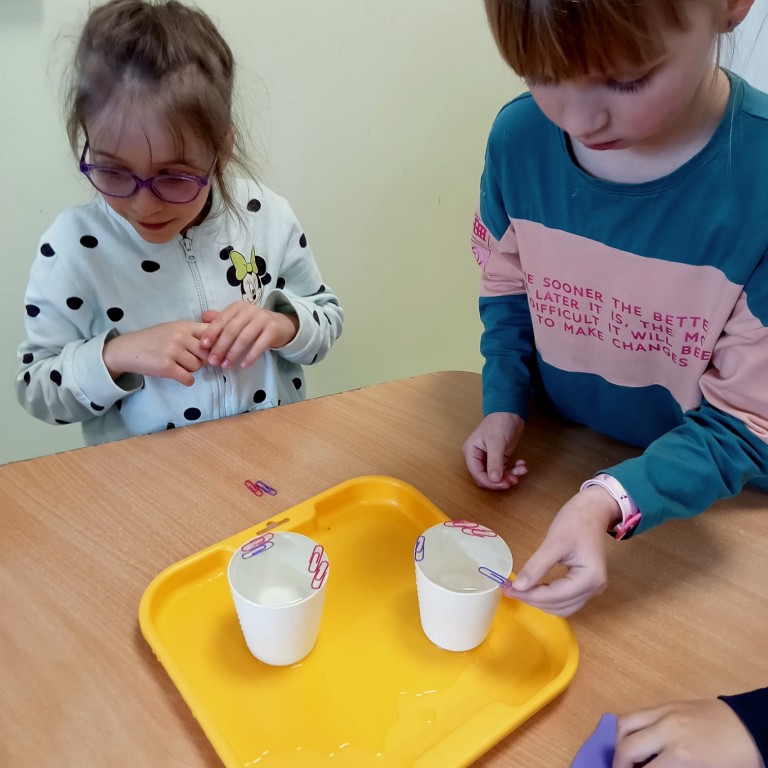 Badanie, czy można na wodzie położyć metalowe spinacze biurowe, czy będą pływały, mimo że metal tonie.