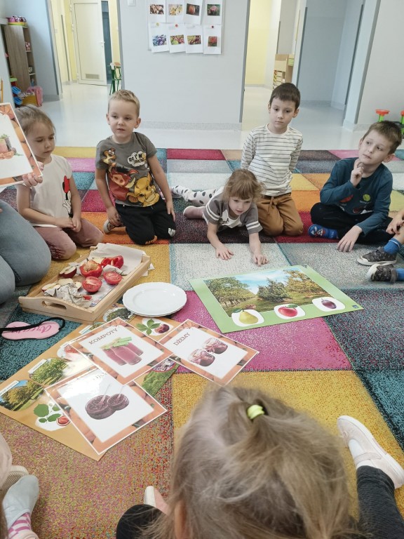 Dzieci nie tylko oglądały owoce i warzywa z zewnątrz, ale też sprawdzały, co kryje się w ich środku – ile pestek ma jabłko, gruszka czy papryka? A jak wygląda środek pomidora?