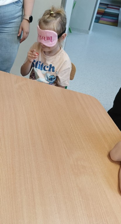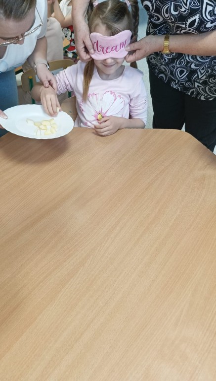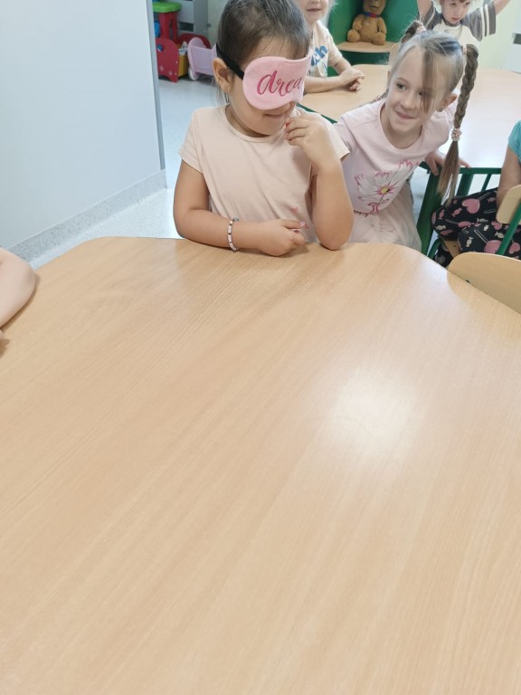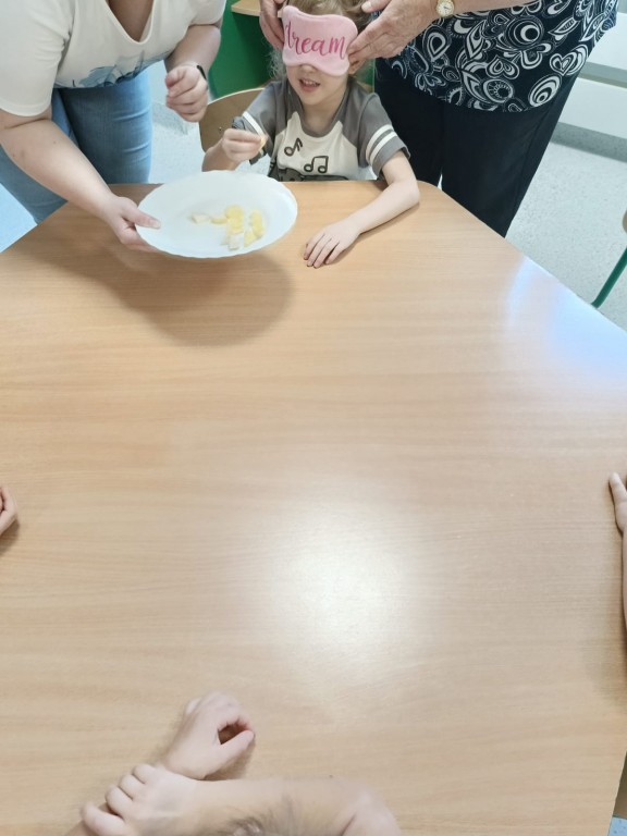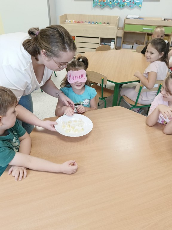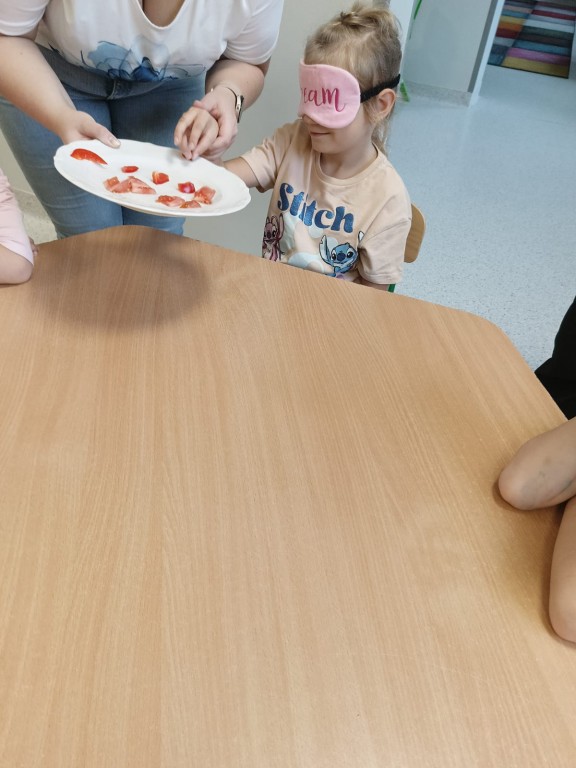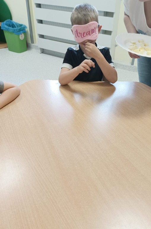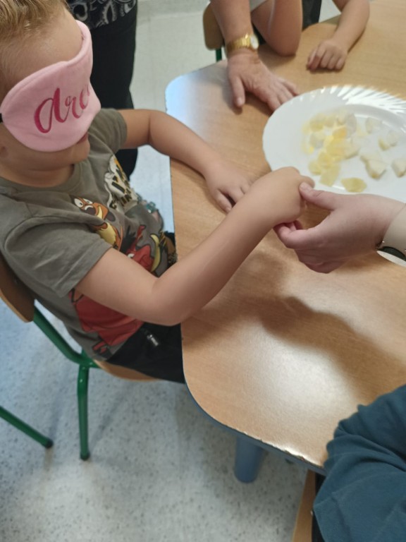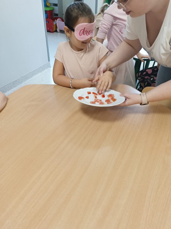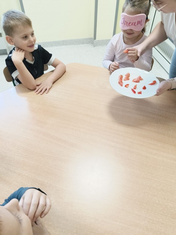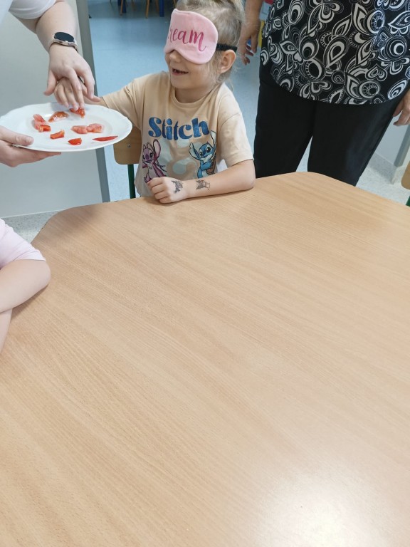 Następnie dzieci z zasłoniętymi oczami rozpoznawały owoce i warzywa za pomocą węchu i smaku. Było dużo śmiechu, ale i wielkie skupienie, bo nie wszystko dało się odgadnąć tak łatwo!